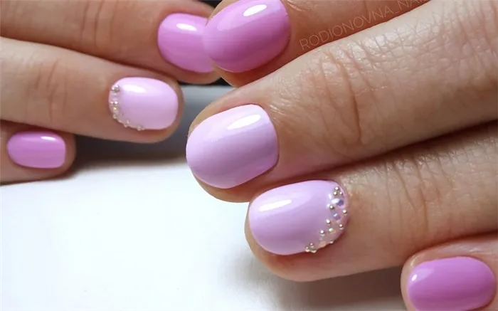 - лаки нежных оттенков дополняют небольшими стразами, расположенными по всей длине внешнего края ноготка.