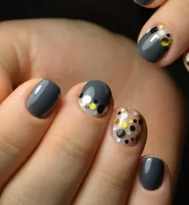 - легкое напыление блесток на один ноготь на базовый цвет покрытия;