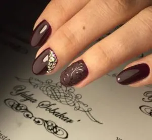 Допускается использование декоративных элементов на коротких ногтях. Единственное условие — умеренность таких композиций, так как переизбыток блеска, узоров и мотивов в этом случае выглядит нелепо.