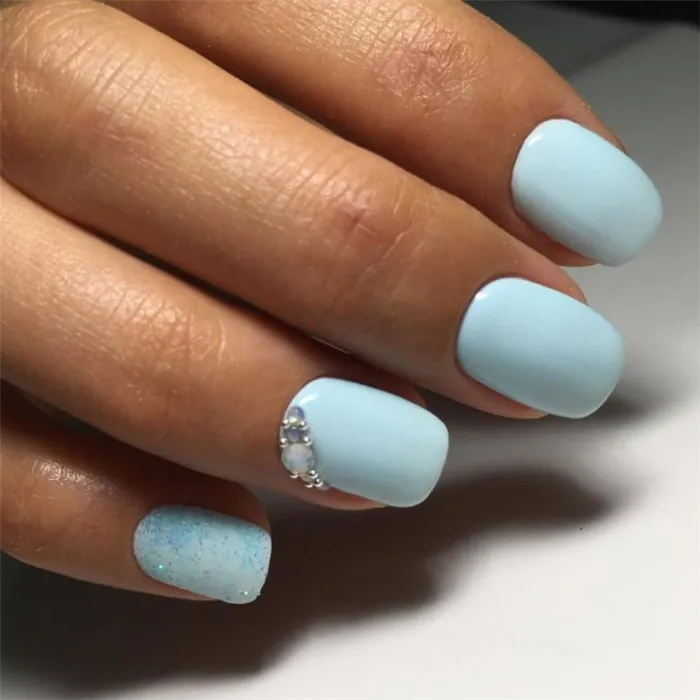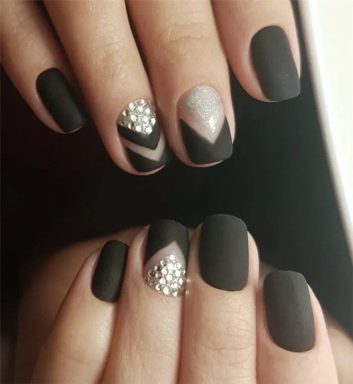 Настоящим украшением для каждой девушки является палец, усыпанный блестящими стразами. Декоративные, прозрачные камни сверкают на солнце и создают эффект дорогих серебряных ногтей. Стразы приклеиваются к ногтевой пластине с помощью карандаша для бровей или дотса.