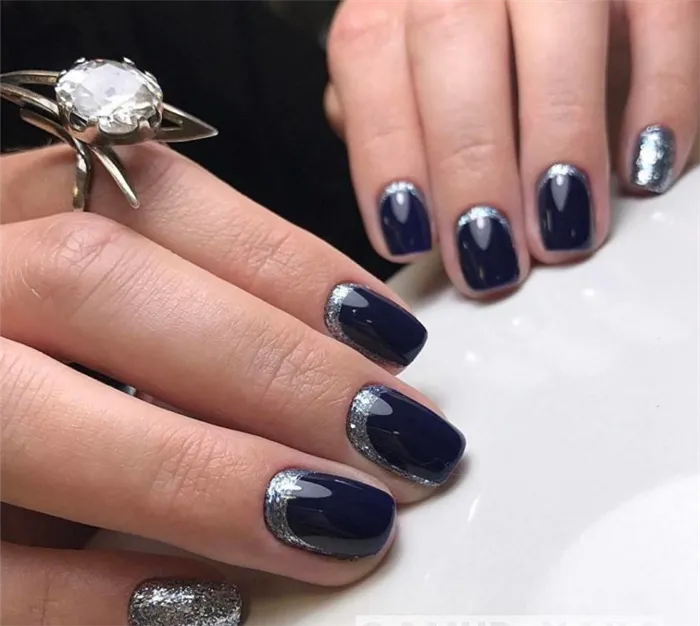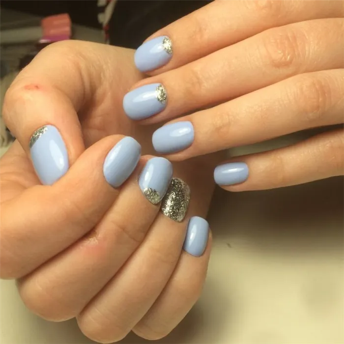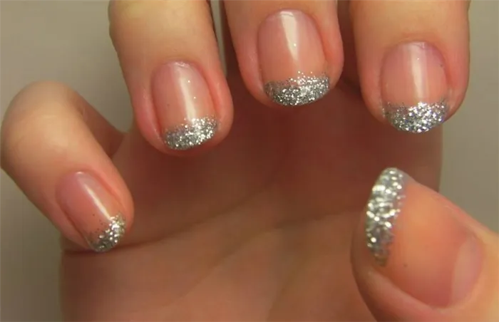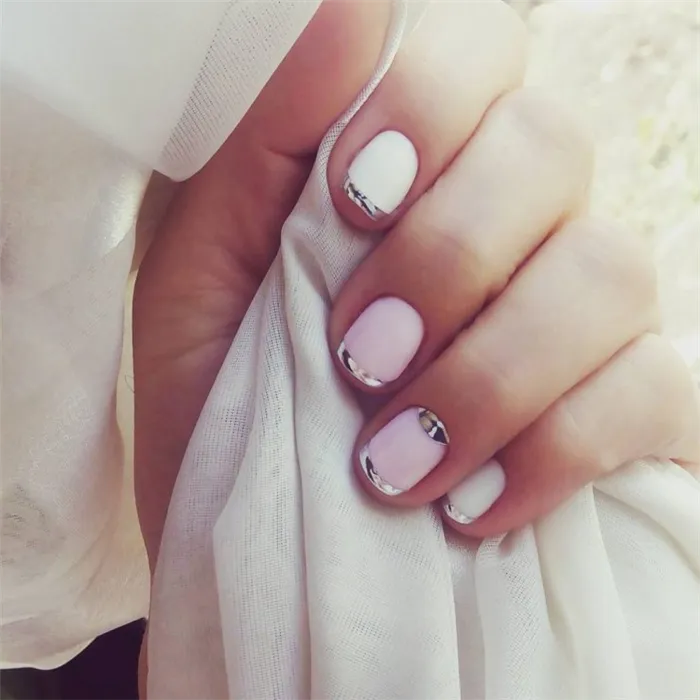 Мягкие оттенки серебра без блеска смотрятся более выигрышно и воздушно на коротких ногтях. Достаточно добавить блеск, чтобы пастельный или нюдовый маникюр засиял новыми красками. Классические французские фасоны с серебряными стразами, полосками или серебряной отделкой пальцев помогают сохранить здоровый вид.