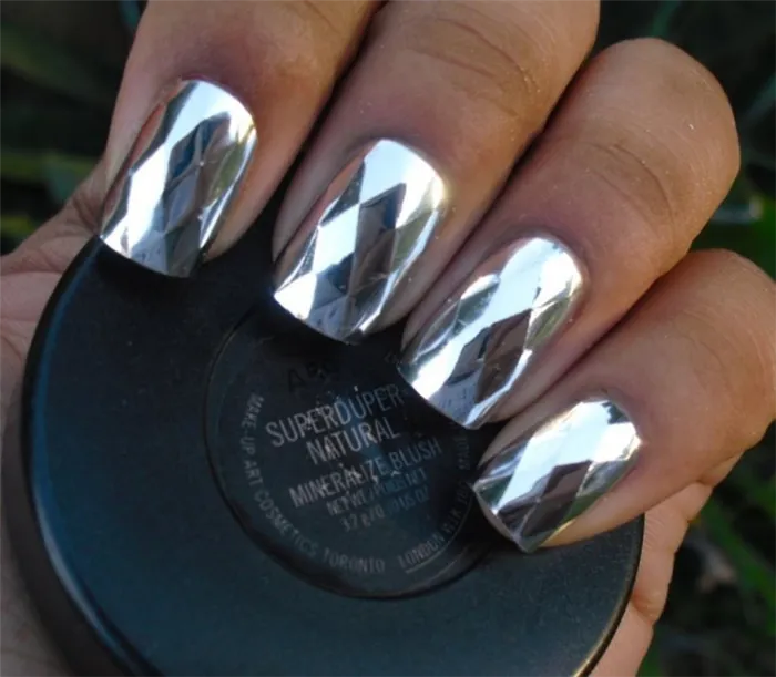 Чтобы получить необычный серебряный нейл-арт, мастера используют различные техники декорирования зеркал, гибберию, глиттер, фольгу и наклейки. Можно также использовать специальные ленты.