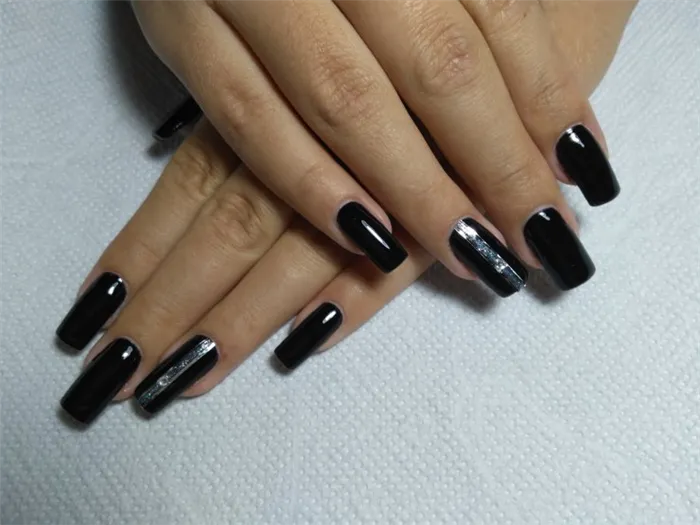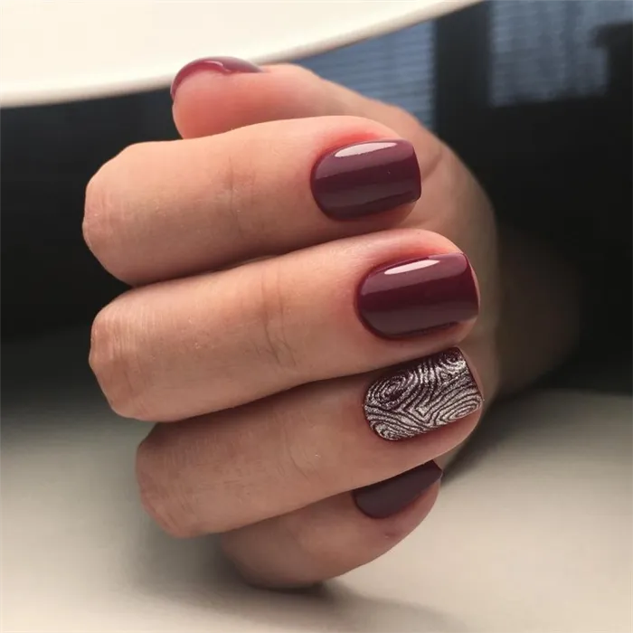 Чтобы визуально удлинить короткие ногти, стилисты рекомендуют обратить внимание на полоски серебра на черном, бордовом, черном или серо-фиолетовом фоне. Для достижения эффектного результата рекомендуется выбрать матовый лак и дополнить его крестообразно пересекающимися карциномами или параллельными серебряными полосками.