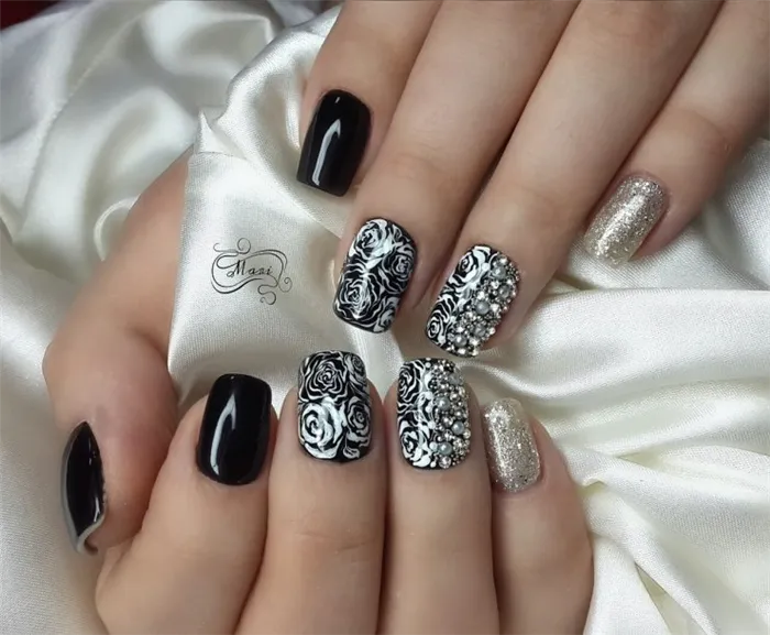 Серебряный маникюр + дополнительные дизайны с рисунками или стразами: фото 2022-2023 годов