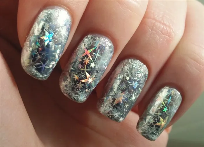 Серебристые ногти с маленькими блестящими пятнышками — один из любимых вариантов для девушек. Голографический эффект достигается благодаря специальному мелкодисперсному пигменту, который плотно покрывает каждую подложку с первого контакта. Они натираются сверху, не оставляя липкого слоя. Сверкающий серебряный лак для ногтей с блестками выглядит великолепно на фотографиях.
