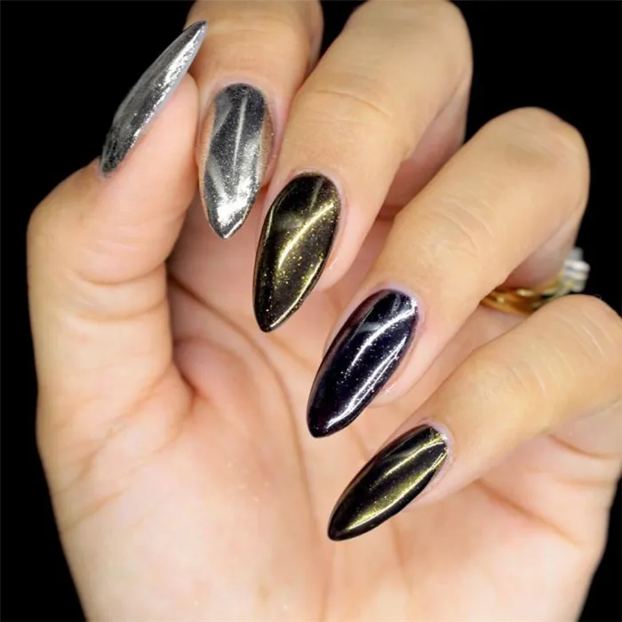 В следующем видеоролике показаны пять способов создания зеркального металлического маникюра.