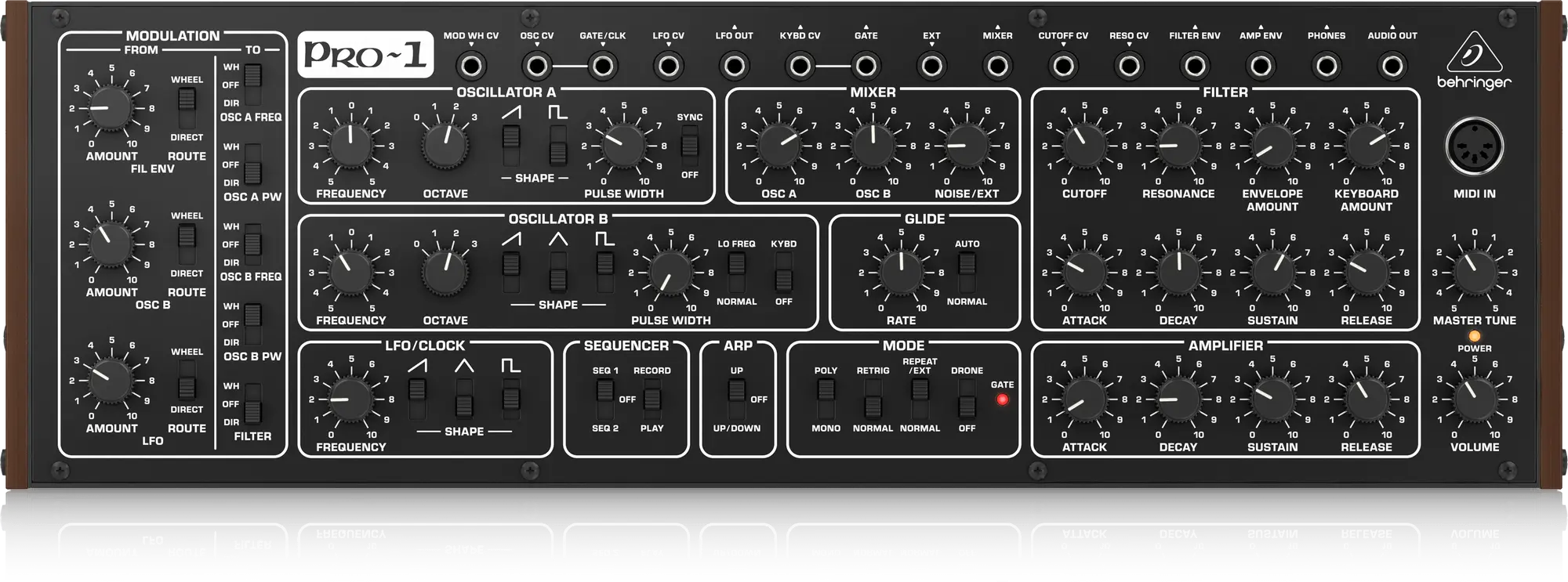 Behringer PRO-1 — это полностью аналоговый монофонический синтезатор, вдохновленный классической моделью Sequential Pro-One 1980-х годов. Он предлагает аутентичный аналоговый тракт сигнала с двумя VCO на чипах Curtis 3340 и 3320, обеспечивая мощный и теплый звук для создания басов, лидов и текстур.