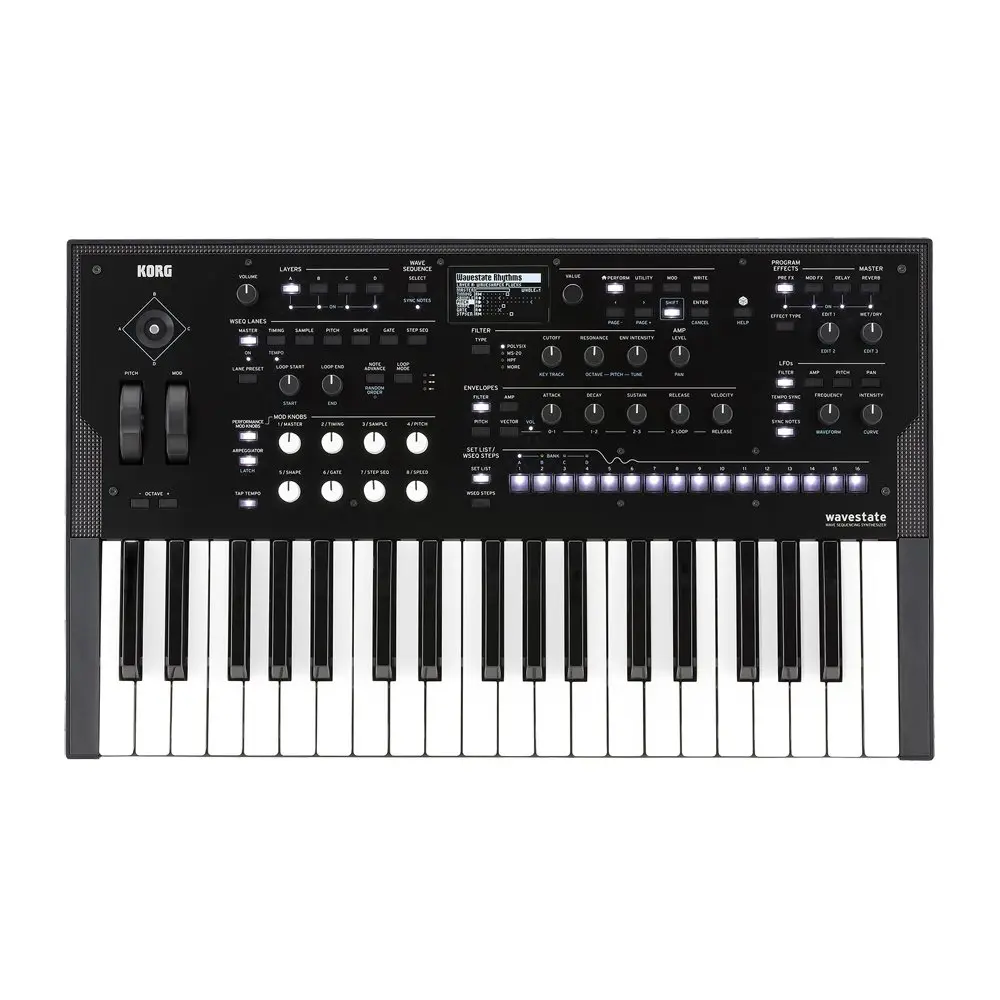 Korg Wavestate — это цифровой волновой синтезатор с 37 полноразмерными клавишами, представляющий собой следующий шаг в эволюции цифрового синтеза. Он использует инновационный звуковой движок Wave Sequencing 2.0, который обеспечивает полифонию до 64 стереоголосов и открывает безграничные возможности для звукового дизайна.